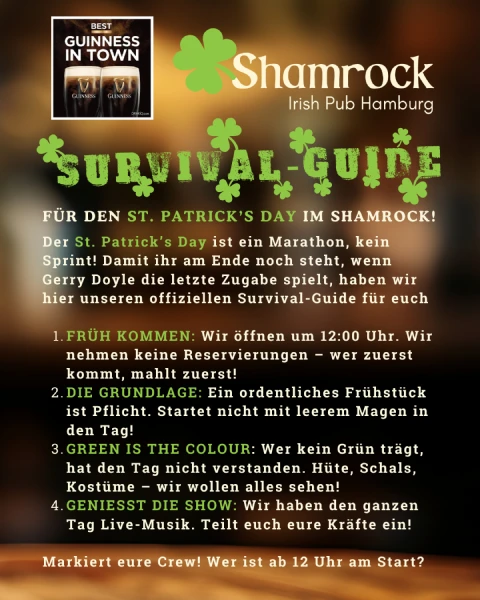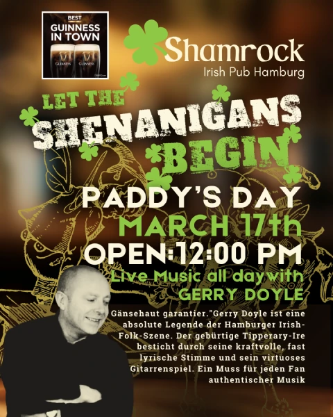 Kommt freitags und samstags zu uns um Livemusik zu hören. Jeden Freitag spielt ein professioneller Musiker normalerweise ab 20:00 Uhr Shamrock. Während der Aufführung zeigen wir weiterhin Sport auf unseren 6 Bildschirmen. So können alle Live-Sport genießen oder den Musikern zuhören. Die Musikrichtungen reichen von Irish Folk bis hin zu zeitgenössischer Musik wie Rock, Indie und populären Liedern, die uns alle begeistern. Jeder Musiker ist außergewöhnlich talentiert.